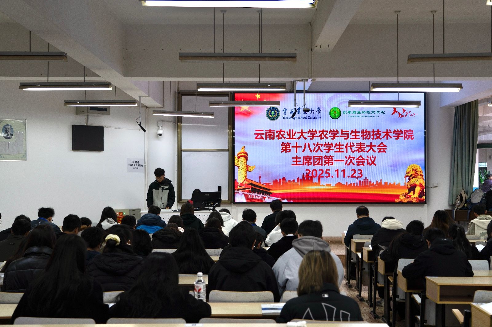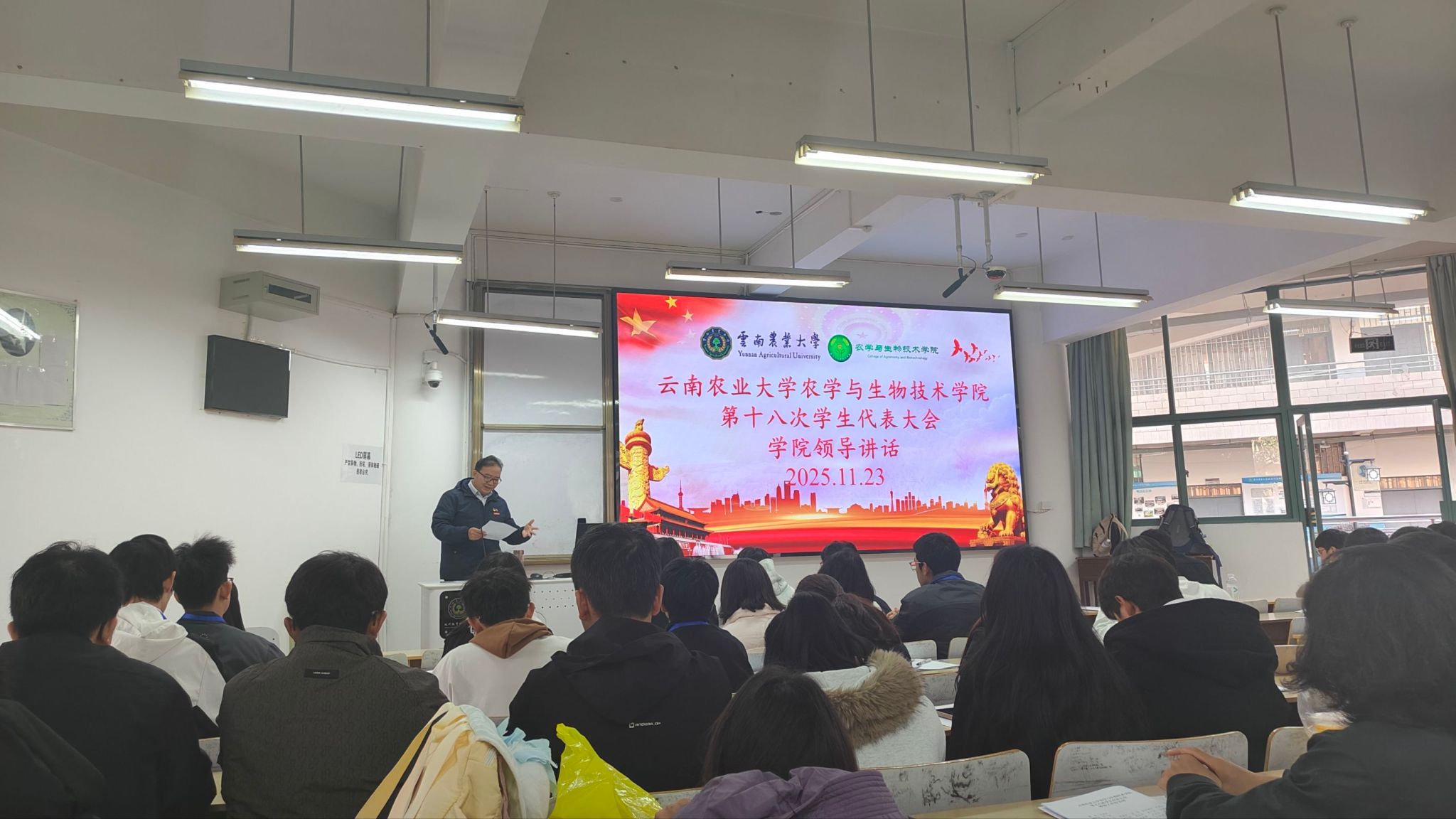 2025年11月23日,云南农业大学农学与生物技术学院第十八次学生代表大会胜利召开。本次大会以“挺膺青春担重任,笃行实干兴农邦”为主题,全面总结过去一年学生会工作,选举产生新一届学生委员会与学生会主席团,进一步明确未来工作方向,凝聚全院青年学子共同投身学院发展与强国建设的生动实践。